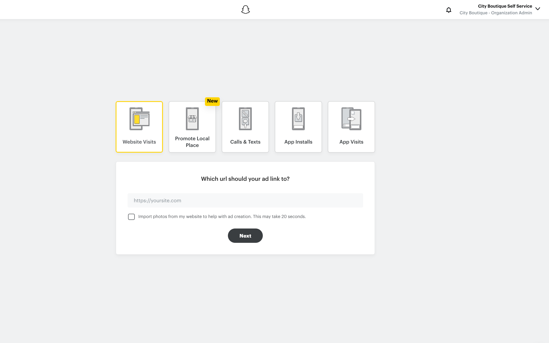 1. Select your objective: web visits, promote local place, calls and texts, app installs or app engagement