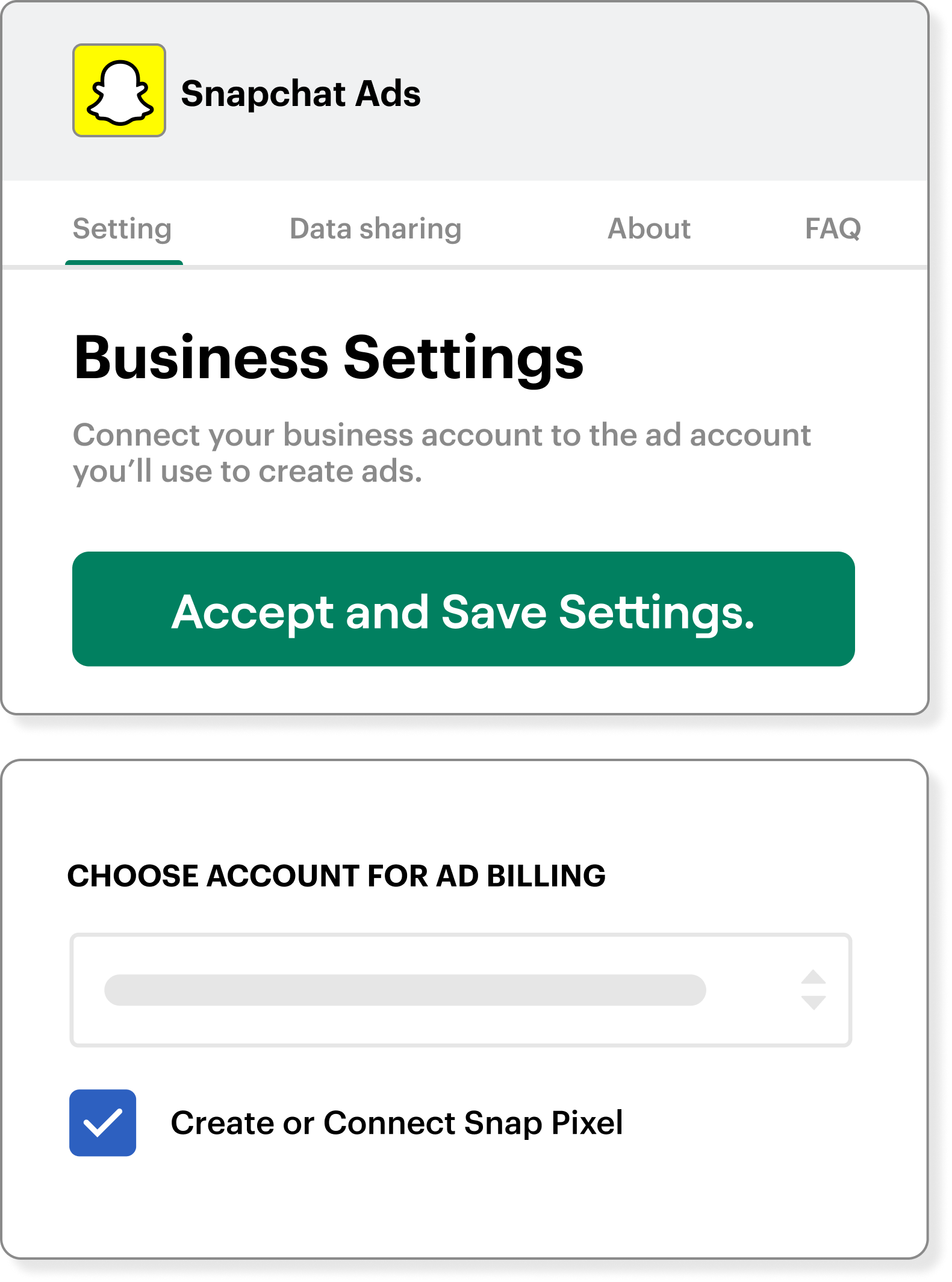 In the Shopify UI, under Snapchat Ads, under the Settings tab, mark the required fields and Accept and Save Settings. Reference this process.