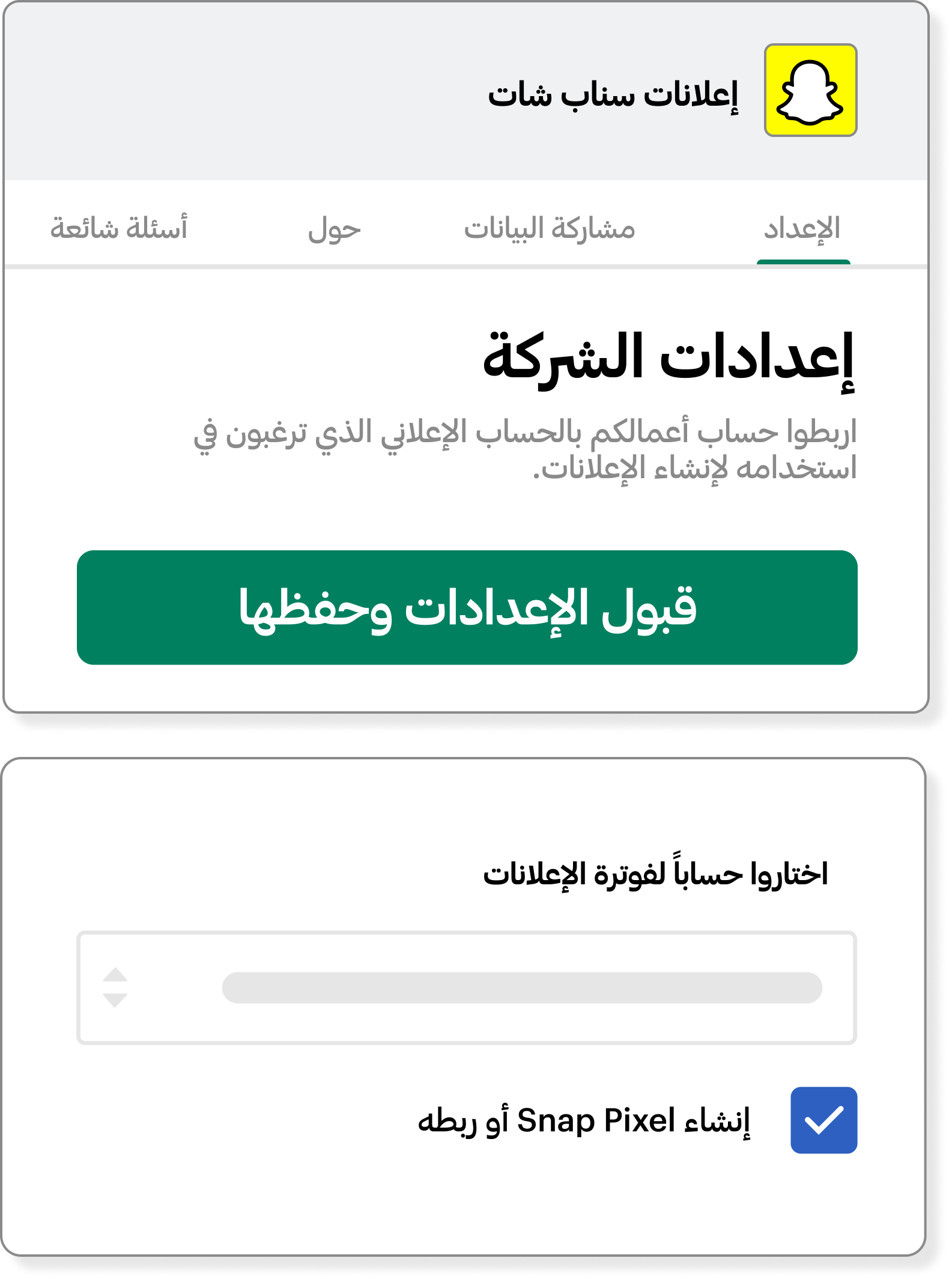 على منصة Shopify، وتحت إعلانات سناب شات، ضمن علامة التبويب الإعداد، ضعوا علامة على الحقول و"قبول الإعدادات وحفظها". راجعوا هذه العملية.