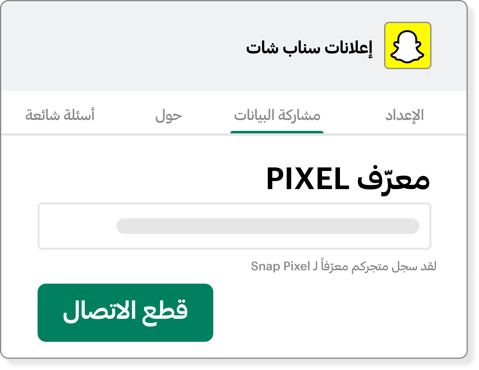 6. في واجهة مستخدم Shopify، وضمن إعلانات سناب شات، انقروا على علامة التبويب مشاركة البيانات. يجب أن يكون معرّف pixel متصلاً بالفعل. إذا لم يكن الأمر كذلك، فيرجى تحديث الصفحة.