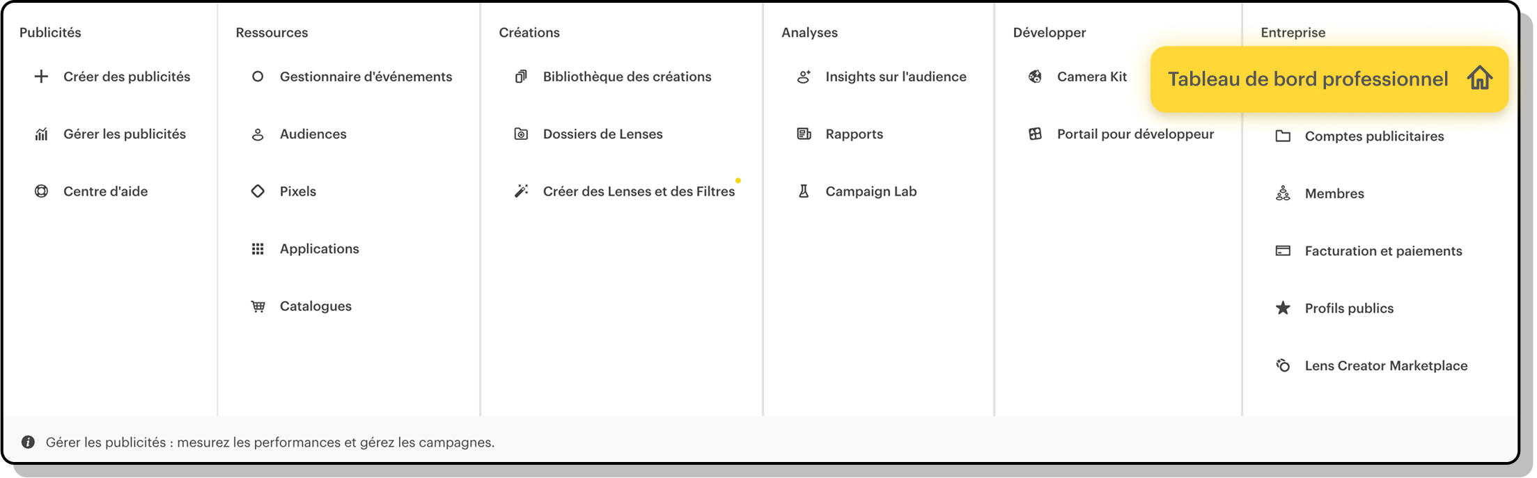 Dans Ads Manager, accédez au tableau de bord professionel dans le menu déroulant en haut à gauche.