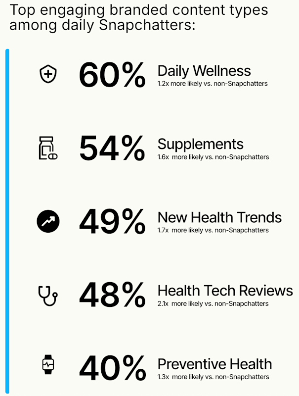 Social platforms have become an important tool for Snapchatters as they navigate complex health decisions. Snapchatters are nearly 3x more likely to engage daily with wellness content on social platforms than non-Snapchatters, with their interest spanning several health categories: