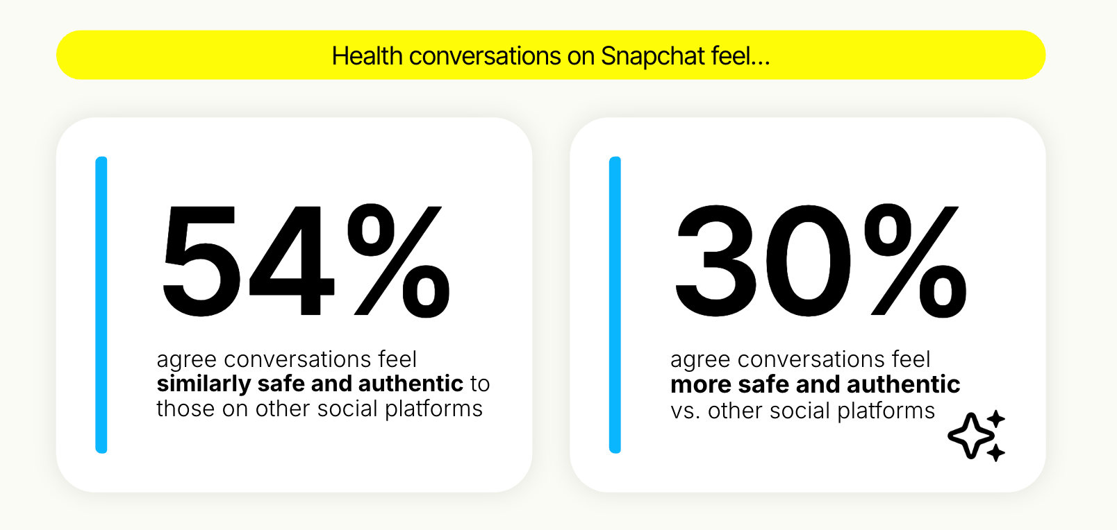 The environment in which these decisions are discussed is just as important as the information itself. Notably, Snapchat is viewed as a uniquely trusted space for these types of sensitive conversations. Snapchatters see the platform just as, if not more, safe and authentic compared to other social platforms: