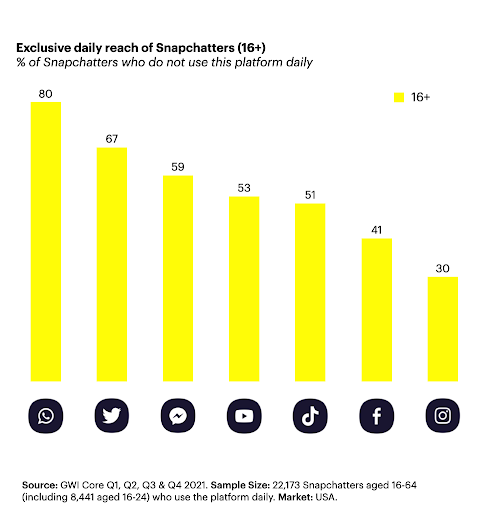 Within the US specifically, the research found that 51% of daily Snapchatters age 16+ do not use TikTok every day, 41% do not use Facebook every day and 67% do not use Twitter every day.