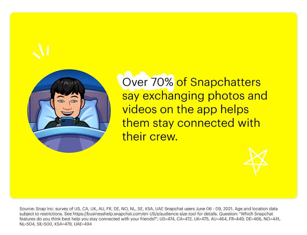 When Snapchatters take to the app with their friends, they’re all about sharing life updates and letting their silliness shine; nearly 3 in 4 Snapchatters talk to their friends about their day-to-day lives using the app. 1 77% of Snapchatters are using more Snapchat features than they were a year ago, 2 and nearly half agree that Bitmojis make communicating more fun. 3