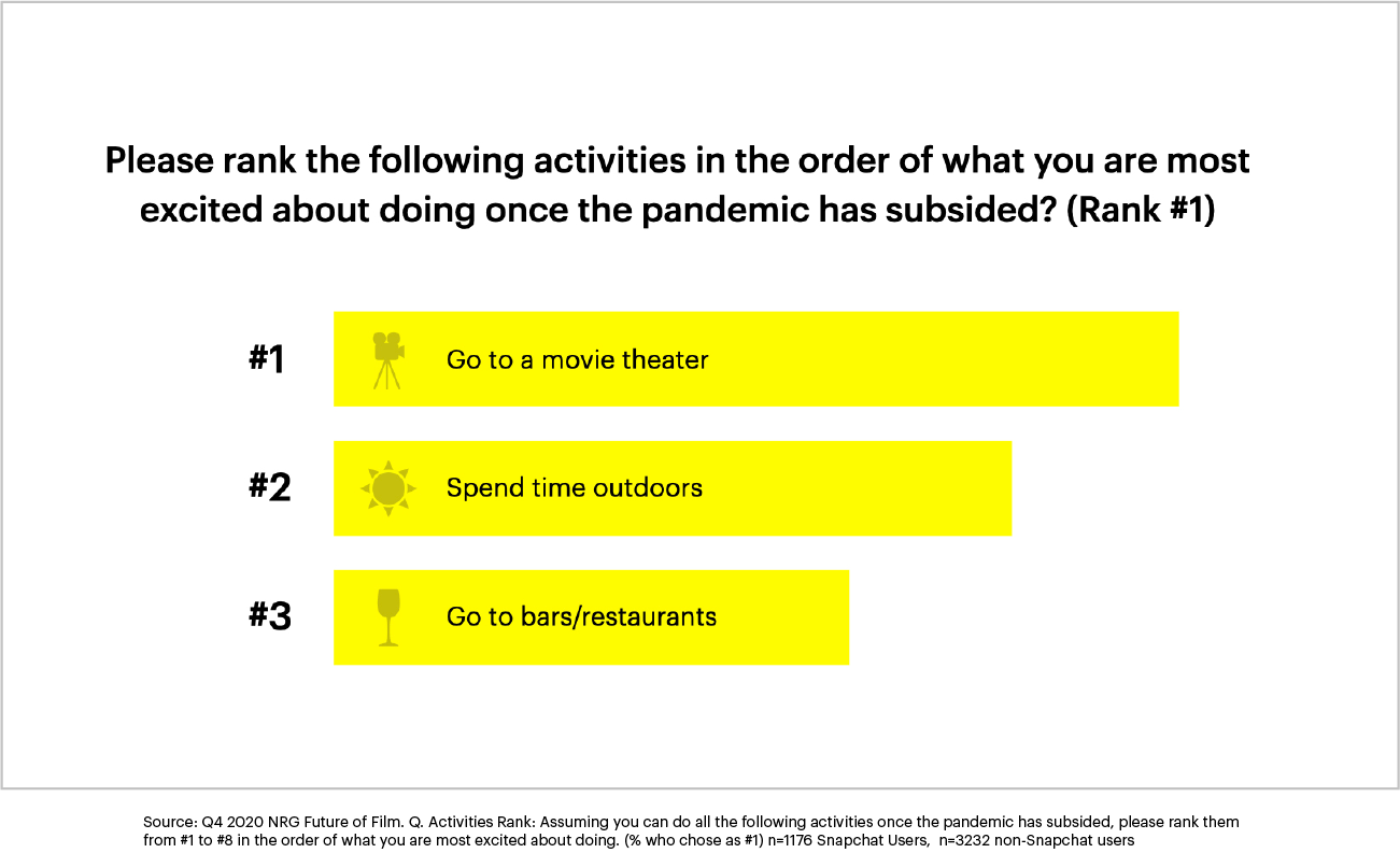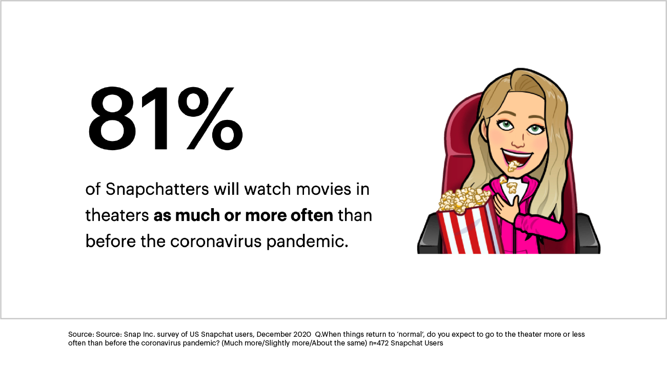 Lights, camera, action! Vaccines are continuing to roll out, movie theaters are slowly reopening around the country, and there’s nothing Snapchatters are more excited about than going back to theaters. In fact, it’s the #1 thing they’re looking forward to post-pandemic. 1