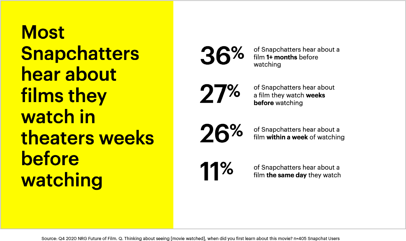 Although COVID-19 drastically accelerated the shift to digital entertainment, Snapchatters have remained avid, engaged fans of going to the movies. Before the pandemic, 74% of Snapchatters in the US were active moviegoers. 2
