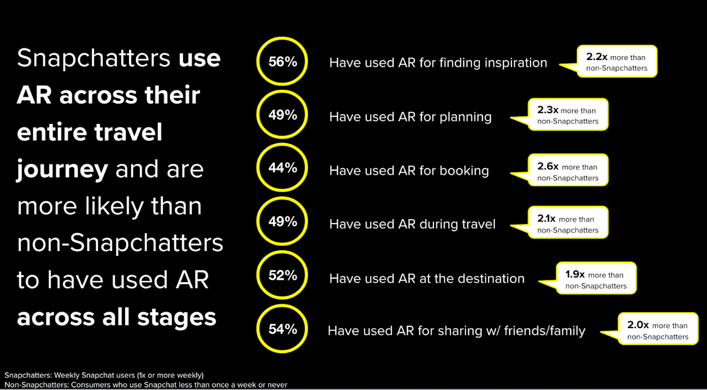 Snapchat is a leader in augmented reality with nearly 250 million Snapchatters engaging with AR every day on average. The study revealed that Augmented Reality on Snapchat is especially effective at impacting the consumer travel journey, with 68% of Snapchatters having used AR during at least one point in their travel journey in the past, compared to only 41% for non-Snapchatters.¹