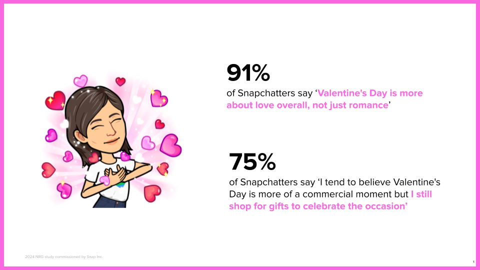 Valentine’s Day offers brands a unique opportunity to connect with Snapchatters in meaningful, impactful ways and to get in front of our highly engaged community of 850 million monthly active users who want to create magical and lovely memories with friends and family.