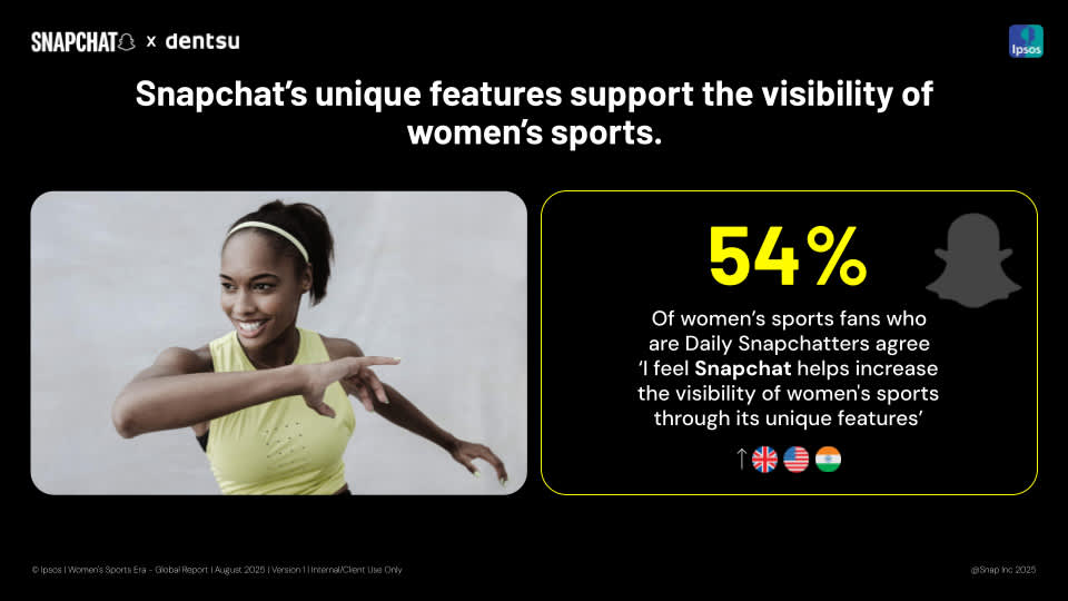 At Snap, we see every day how fans, especially younger audiences, use our platform to celebrate athletes, share their passion, and connect with one another. This research confirms what we’ve long believed: Women’s sports are fueling a new era of fandom, and brands that show up authentically in this space can create powerful, lasting connections.
