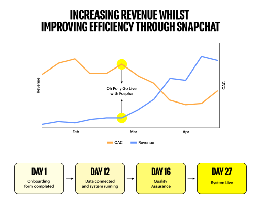 Keeping its customer acquisition costs stable while ensuring significant growth was Oh Polly’s primary aim. As such, Fospha designed a test to scale Snapchat within the US market, working closely with the brand to define measures of success and provide insights into optimisations. These learnings would not have been visible through click-based models, but as Snapchat is a mobile-first, impression-led channel, Oh Polly could analyse and adapt for best results.