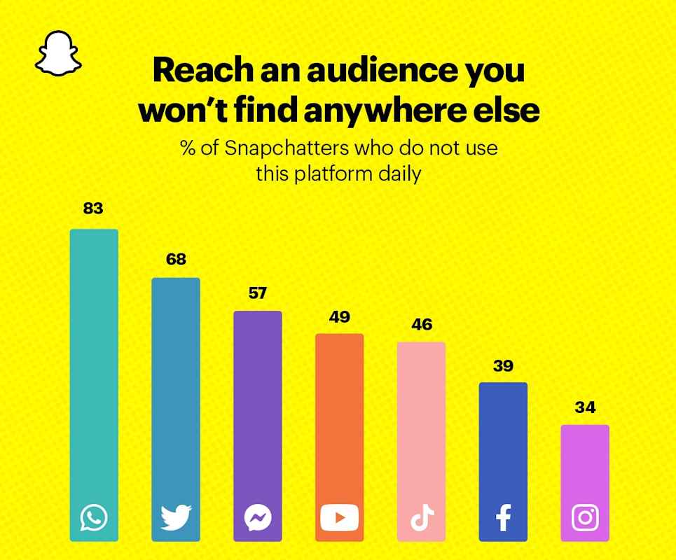 Advertisers can reach more than 750 million people per month on Snapchat.¹ And a large majority of them are unique. Find an exclusive, daily reach of audiences 16+ when compared to every other platform.