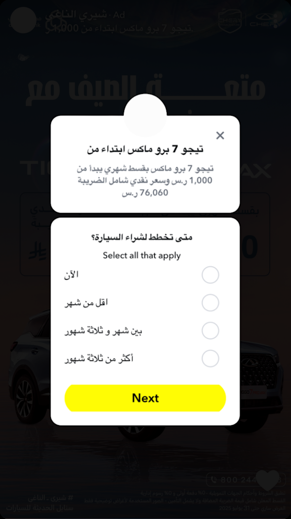 DAS 360 leveraged Snapchat's Lead Generation solutions to reach Saudi audiences, optimizing campaigns with targeted creatives and in-app lead forms that showcased Chery's contemporary design and value-driven proposition.